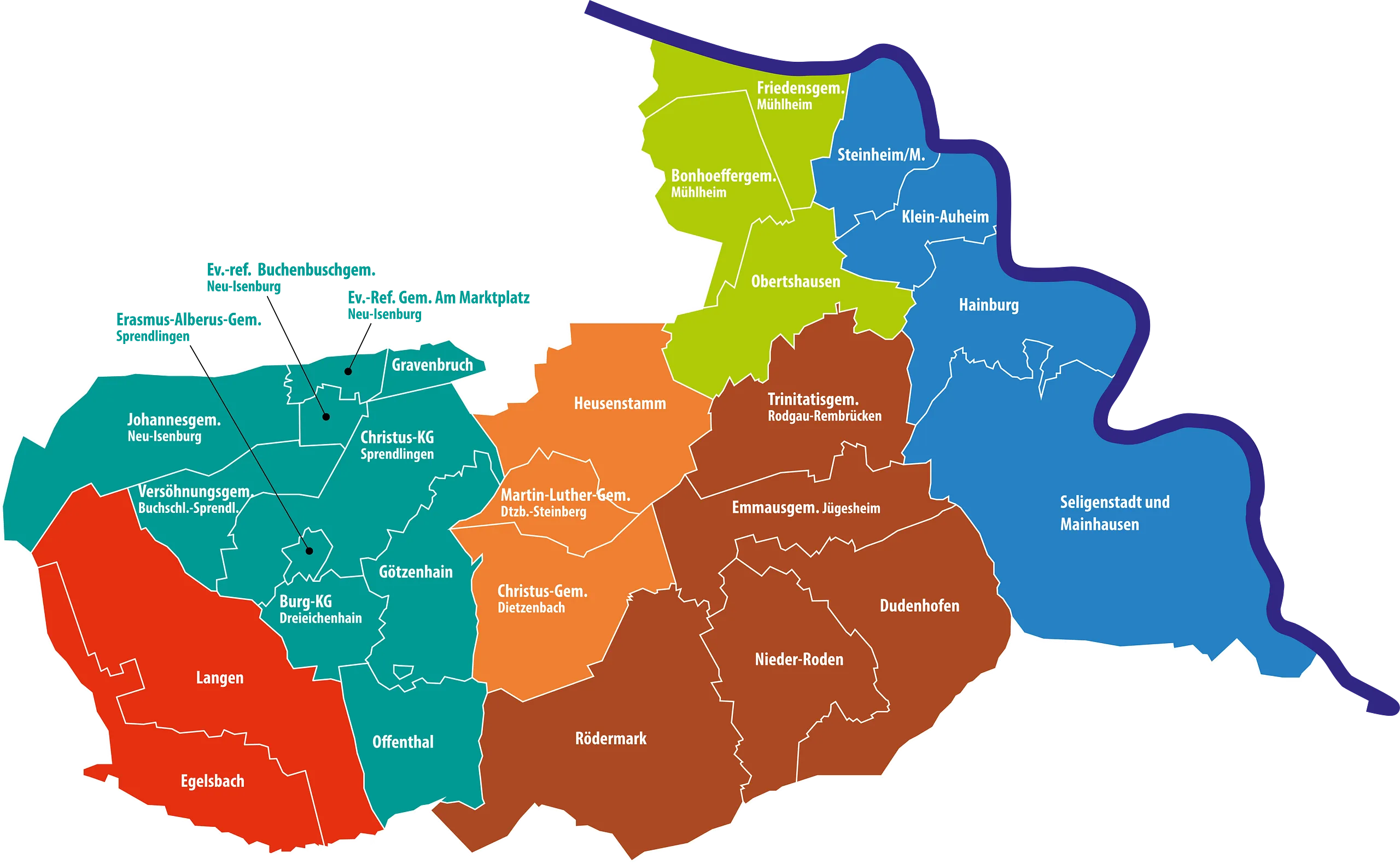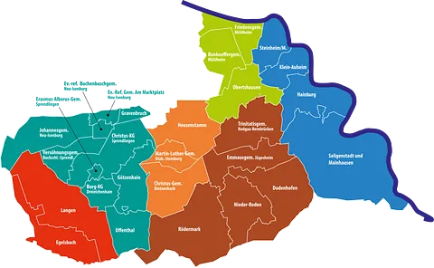 Sechs Nachbarschaftsräume mit 27 Gemeinden zwischen Langen und Seligenstadt bilden die evangelische Kirche bei dir vor Ort.